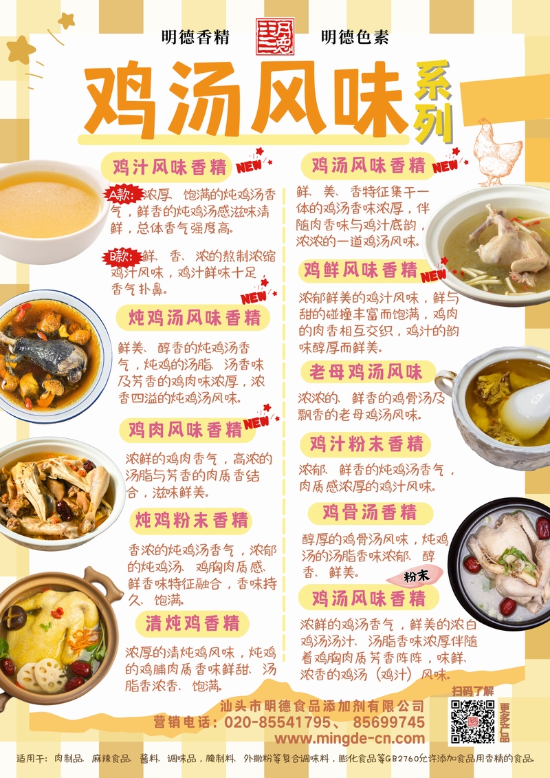 明德雞湯風(fēng)味香精 濃郁鮮香 還原地道雞湯本味汕頭市明德食品添加劑有限公司的雞湯風(fēng)味香精系列,涵蓋雞汁、雞湯、雞鮮風(fēng)味、老母雞湯、雞肉風(fēng)味、雞粉末、雞骨湯、清燉雞等多種品類(lèi)。產(chǎn)品具備真實(shí)的雞肉鮮香、湯香、油香與骨香特征,能夠為醬料、調味品、肉制品、腌制料及復合調味料等B端應用提供穩定、濃郁的雞湯風(fēng)味解決方案,幫助工廠(chǎng)快速打造風(fēng)味醇厚、回味悠長(cháng)的雞香產(chǎn)品。